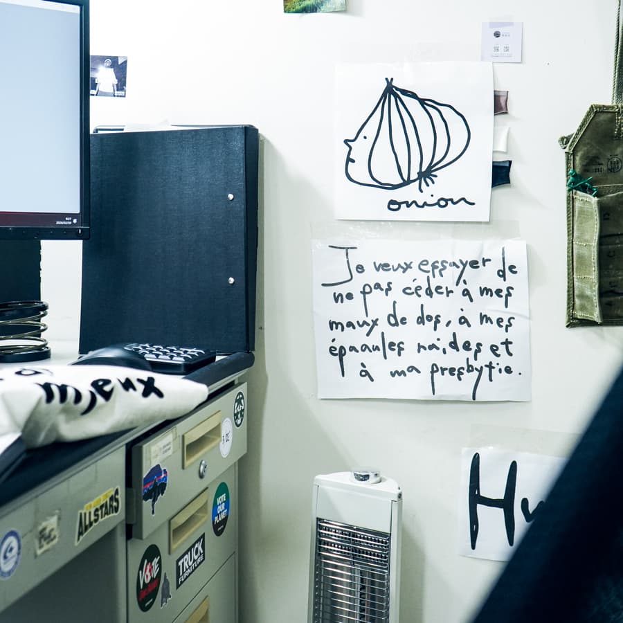 コマキさんの好きが反映されたデスク周り。企画中の洋服デザインやコマキさんの好きなモチーフが貼られていました。